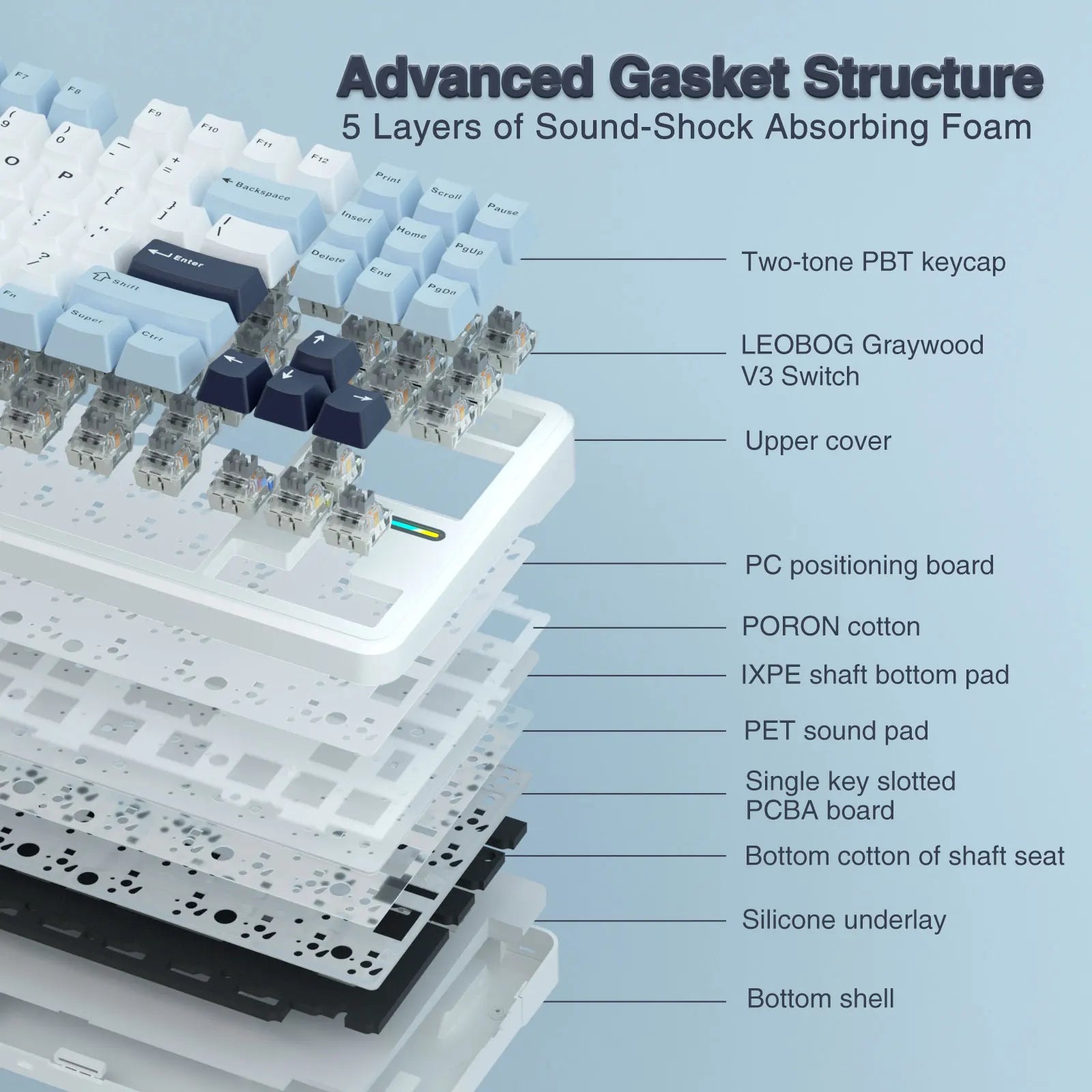 The F87 Pro is designed with a five-layered padding structure, including IXPE under-shaft padding and PORON Cotton, to provide soft acoustics. This design greatly enhances the keyboard's sound quality for a cleaner and quieter typing experience,reducing 98% hollow noise